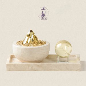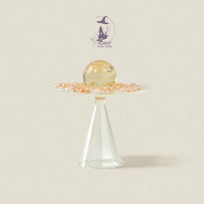 材質: 天然黃冰洲晶主石、能量碎石底座、金屬/木質托盤(請依實際材質填入)