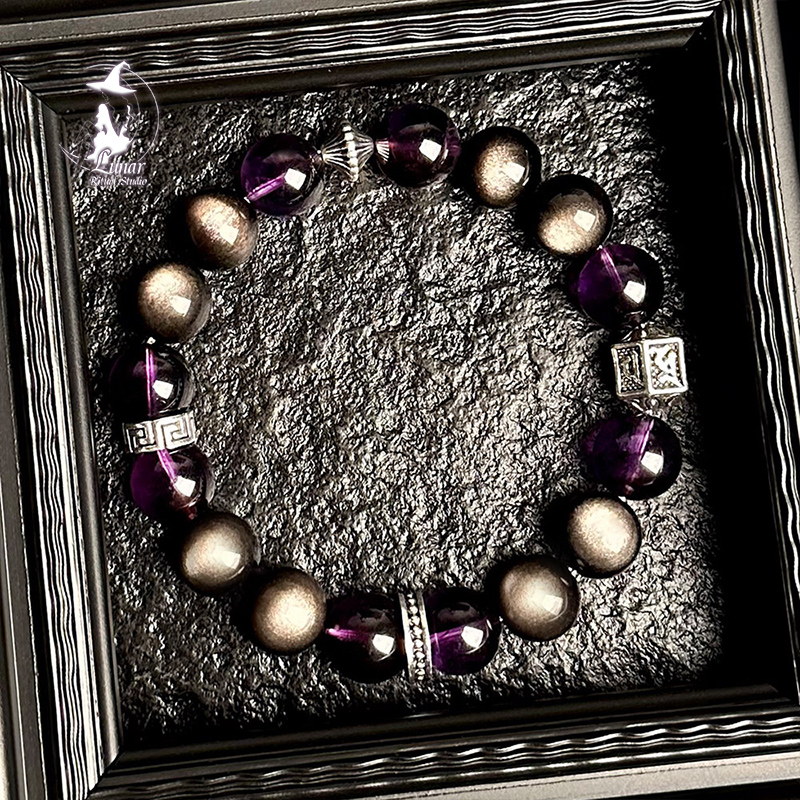 【紫氣東來】天然烏拉圭紫水晶銀曜石手串男招財多寶手鍊生日禮物