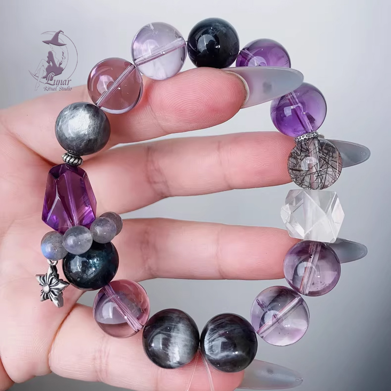 天然黑爆閃海藍寶+星輝骨幹+玻利維亞紫水晶+閃靈原創設計款水晶手鏈手串
