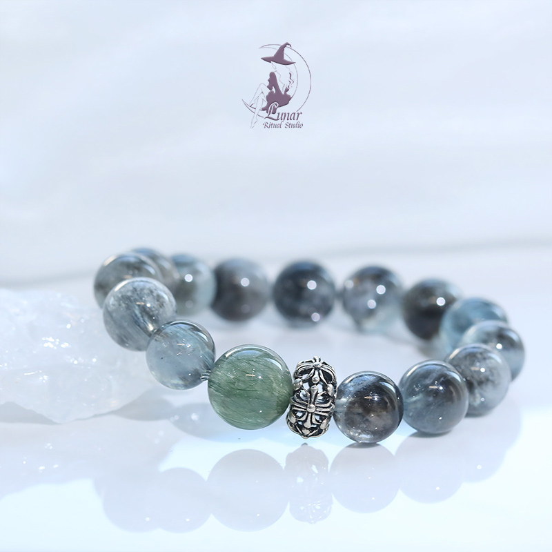 黑爆閃海藍寶綠發晶綠兔毛設計款手串